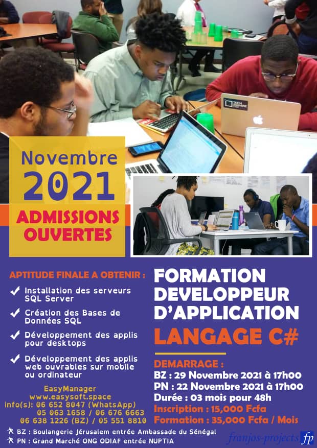 Et enfin, nous vous suggerons de nous poster un message après votre inscription ici . La participation est assujettie au payement des frais d'inscriptions de 15 000 FCFA et 35000 FCFA /Mois pour les 48 Heures de formation en presentiel qui s'etaleront sur 03 mois. le nombre de places disponble etant limité , nous vous saurons gré de nous manifester votre interet rapidement.