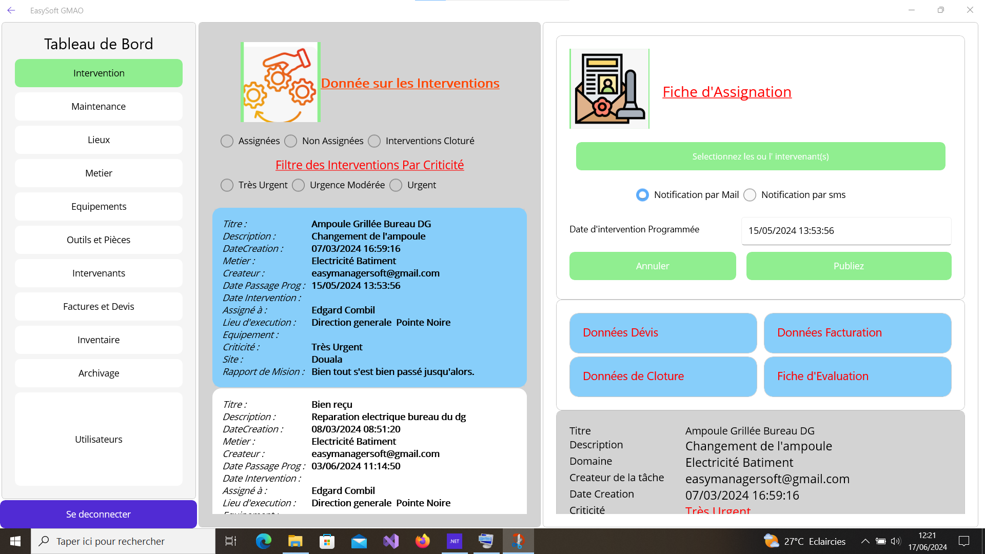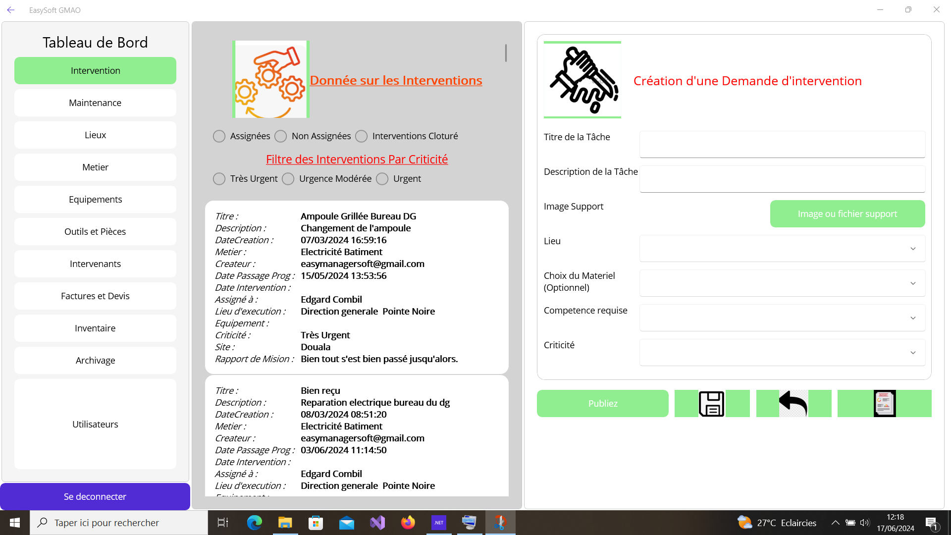 Cette application donc l’objectif principal est l’amélioration de la productivité de l’entreprise emmène tous les intervenants à travailler sur une même plateforme numérique et facilite ainsi le suivi et la traçabilité de l’exécution des tâches assignées; Elle est structurée autour de quelques fonctionnalités essentielles à savoir : Création et gestion des tâches. Les tâches peuvent être créées et assignées aux exécutants par les responsables de l’entreprise. Une demande d’intervention peut également être créée par un utilisateur standard mais la charge de la confirmation et de l’assignation de l’intervention à un intervenant particulier revient aux responsables désignés. Les tâches et demandes d’interventions peuvent être soutenues par des photos et la notification automatique en background par email lors de la gestion de la tâche permet de maintenir toute l’équipe up-to-date dans l’évolution de la gestion de la charge de travail.