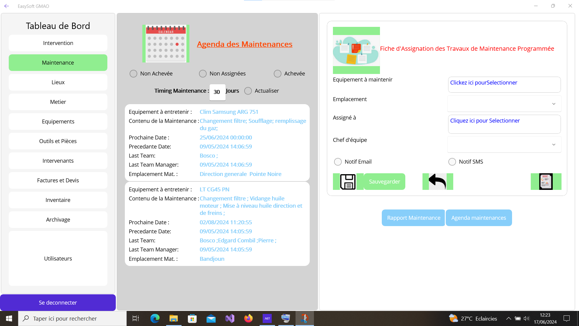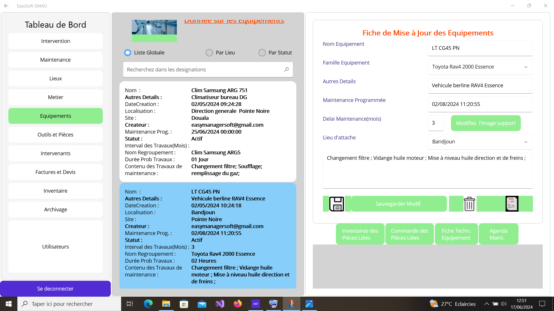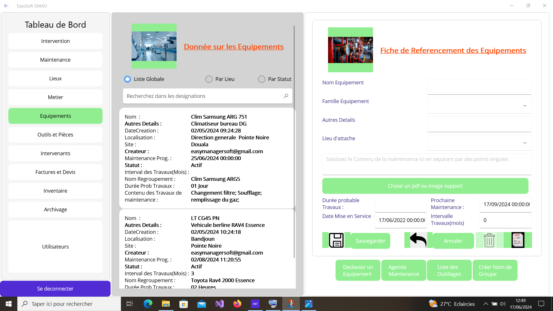 Nous avons construit avec l’aide de nos partenaires techniques une application de Gestion Technique de l’entreprise dénommée EasySoft_xr . Très simple d’utilisation, EasySoft_xr est conçue pour permettre de gérer les maintenances préventives et curatives des équipements, les interventions, les tâches, les outillages, les consommables industrielles et de bureau ainsi que l’archivage des dossiers.